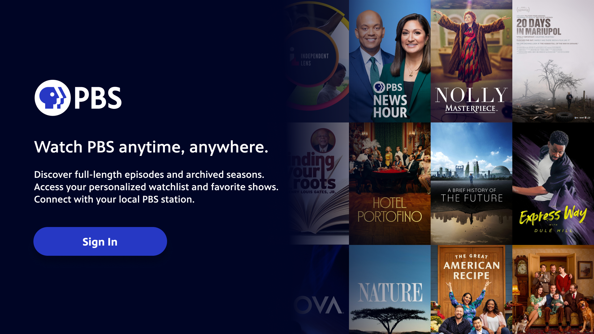 When you first open the PBS app, a screen will appear prompting you to sign in on the PBS app. Select Sign In.