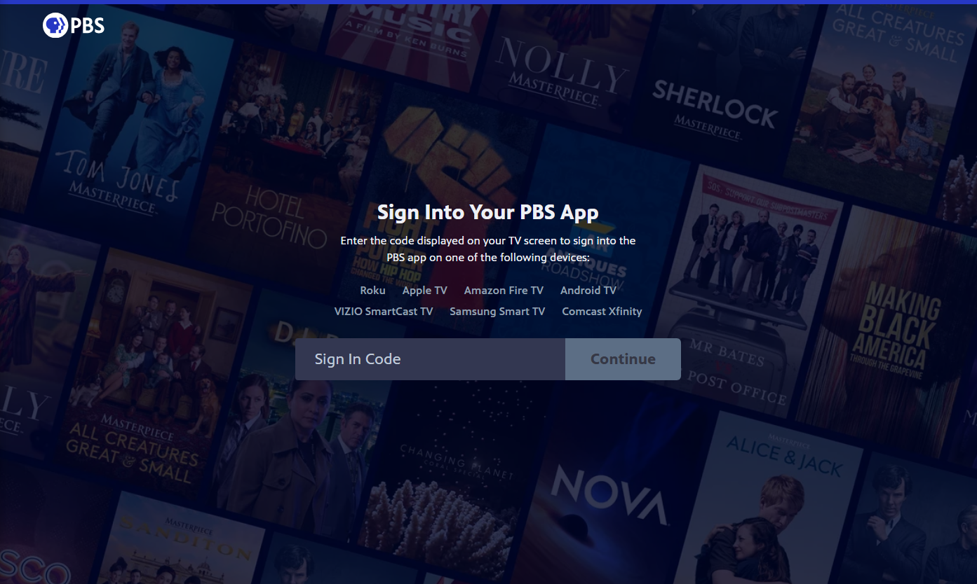 Enter your unique code listed in Step 2 into the Sign In Code box on PBS.org/tv. Select Continue.