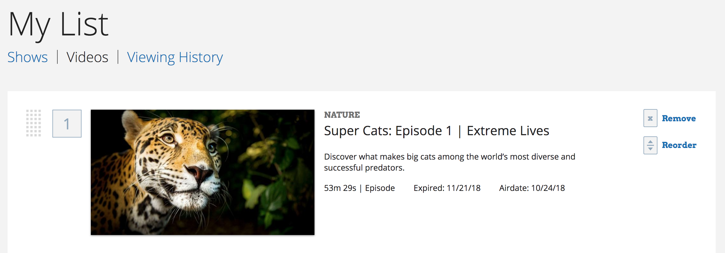 My List is a site feature where you can save shows and videos to view later, or revisit videos you have previously viewed to resume watching where you left off. Previously, this feature was named Watchlist or Favorite Shows.