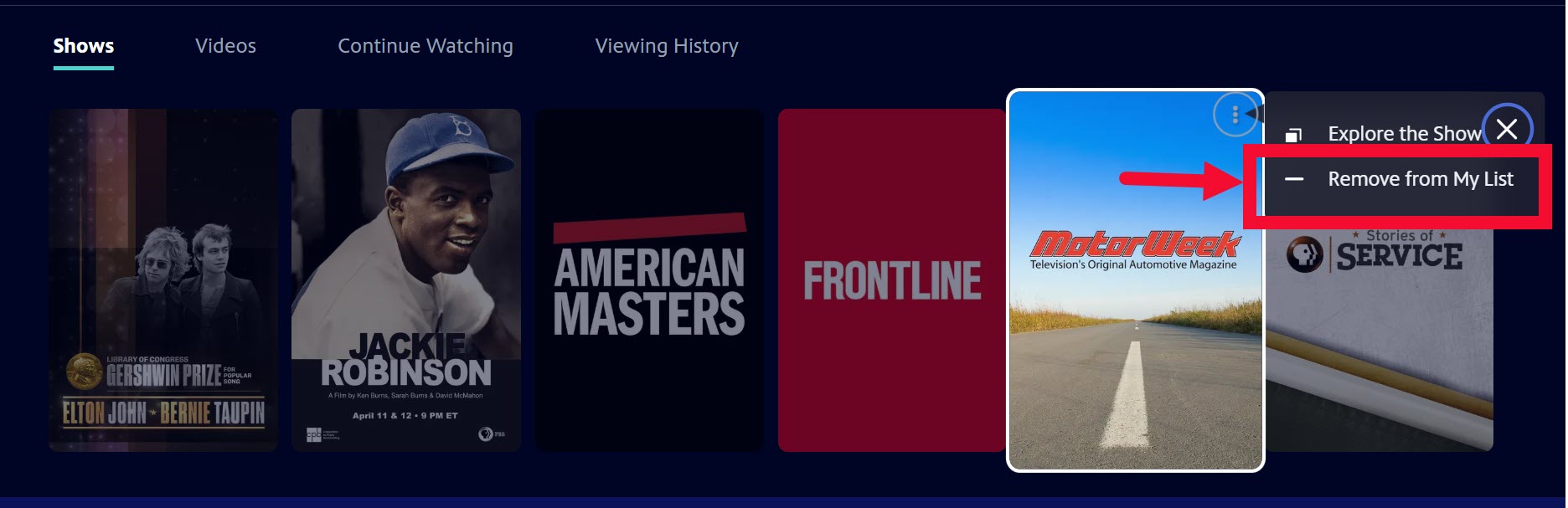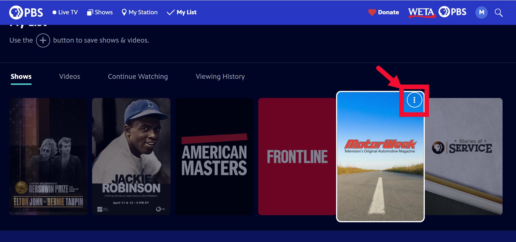 - Hover your mouse over the thumbnail image of the show you want to remove from My List and click the three horizontal dots in the upper right corner of the image (Figure 1).